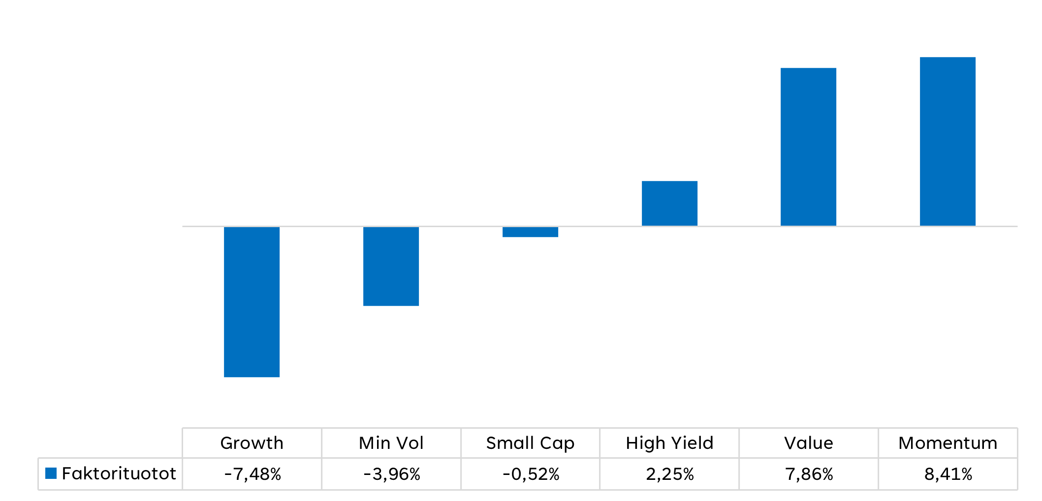 Kuva 2: Faktori yli- ja alituotot Euroopan osakemarkkinoilla (Lähde: Bloomberg, Proprius Partners)