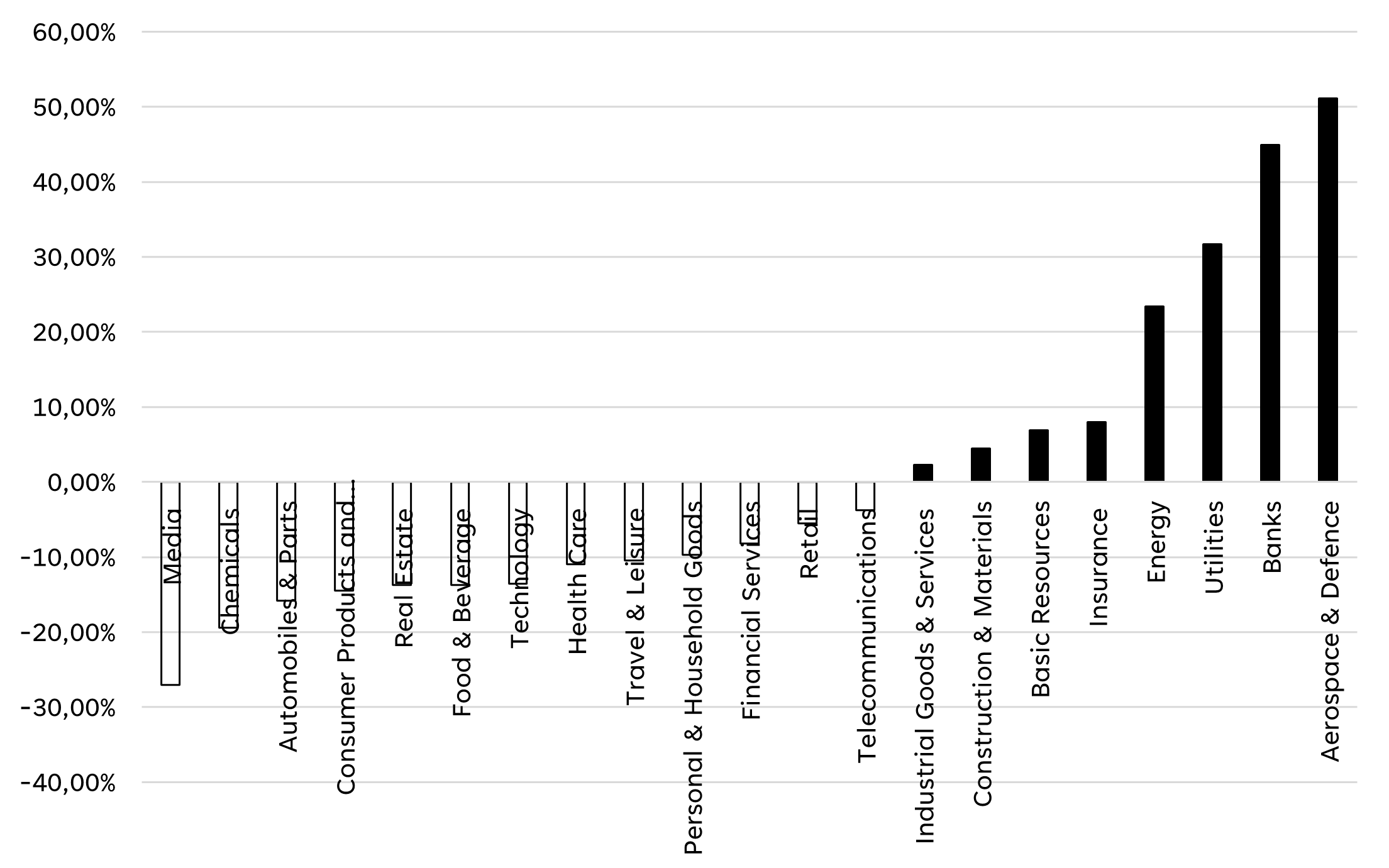 Puolustusala, pankit sekä energia- ja sähköyhtiöt vastasivat valtaosasta Euroopan markkinoiden tuotosta. Tämä teki vuodesta haastavan aktiivisille salkunhoitajille, joilla ei tyypillisesti ollut suuria painoja näillä sektoreilla, erityisesti puolustusalalla ESG-rajoitteiden vuoksi.