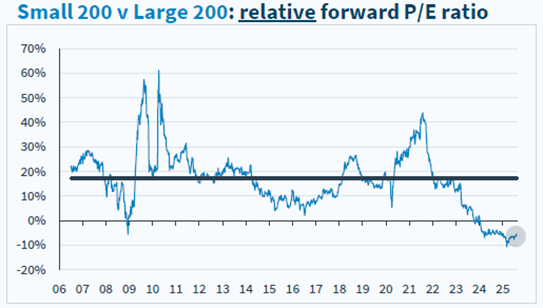 Pienyhtiöt ovat yhä historiallisesti poikkeuksellisella alennuksella suhteessa suuriin yhtiöihin. Tämä ei itsessään laukaise nousua, mutta luo asetelman, jossa huonot uutiset on pitkälti hinnoiteltu ja hyvät eivät.