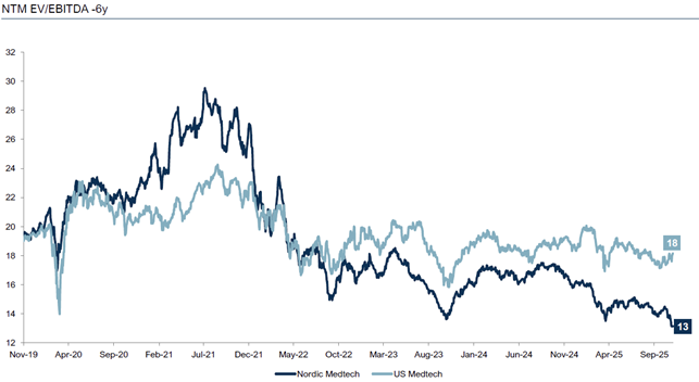 Kuva 5: Pohjoismaisen terveysteknologiasektorin vs. Yhdysvaltojen terveysteknologiasektorin valuaatioiden kehitys viimeiset 6 vuotta (Pareto, FactSet)